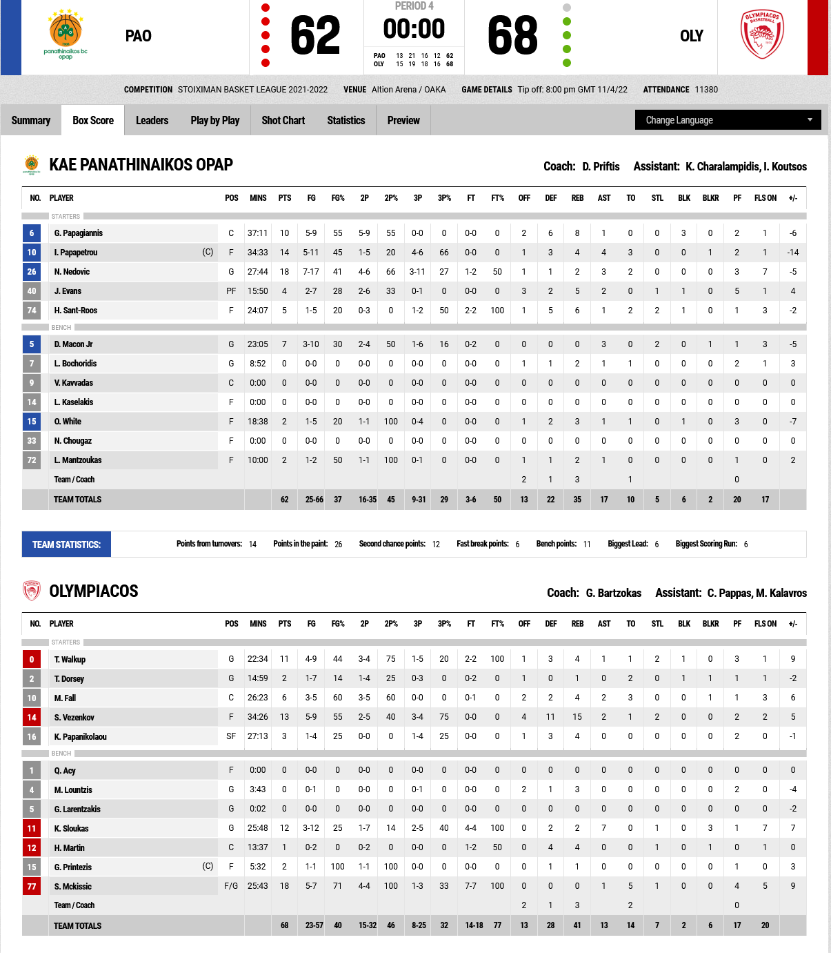 Turnovers and missed rebounds allowed the hosts to lead once again (27-22 at 16’). Shaquielle McKissic and Kostas Sloukas made their presence felt at that point and tied the game 34-34 at 20’.