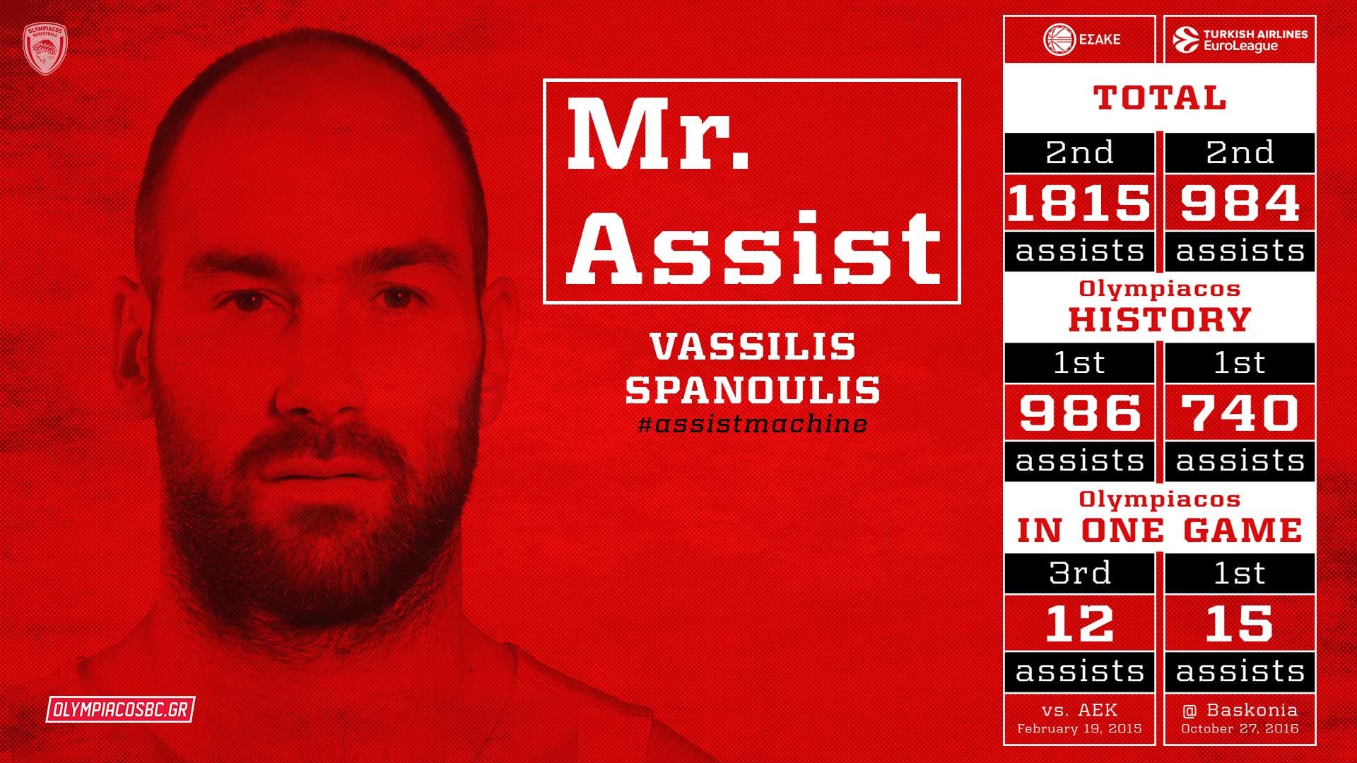 The night of October 27, 2016 is very important both for Vassilis Spanoulis and Olympiacos. The 'reds' got to celebrate a great victory against Baskonia, but this game is going to be of historic significance due to the achievement of the Olympiacos' captain.